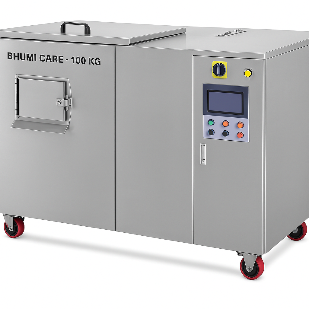 Organic waste such as food scraps, garden waste, and biodegradable kitchen waste is collected and fed into the Bhumi Care OWC. The machine starts the process by shredding and evenly mixing the waste to create ideal conditions for composting.